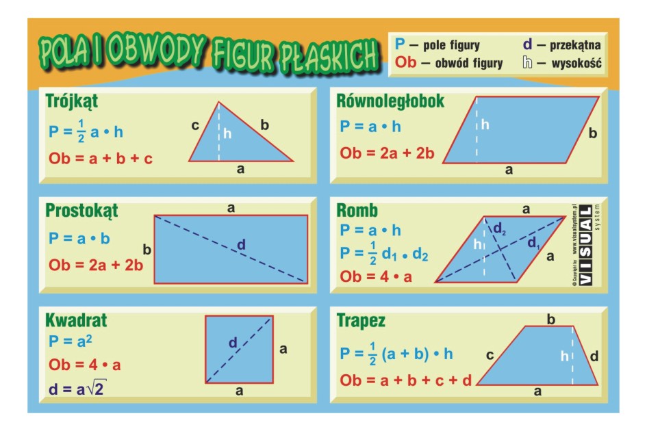 • pola i obwody figur płaskich: trójkąt, prostokąt, kwadrat, równoległobok, romb, trapez
